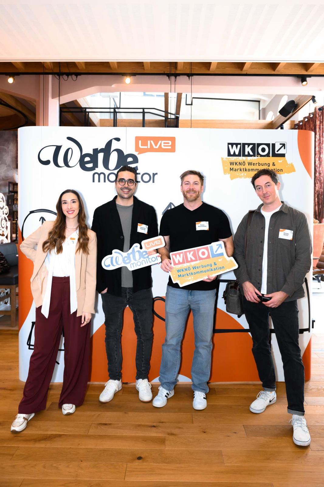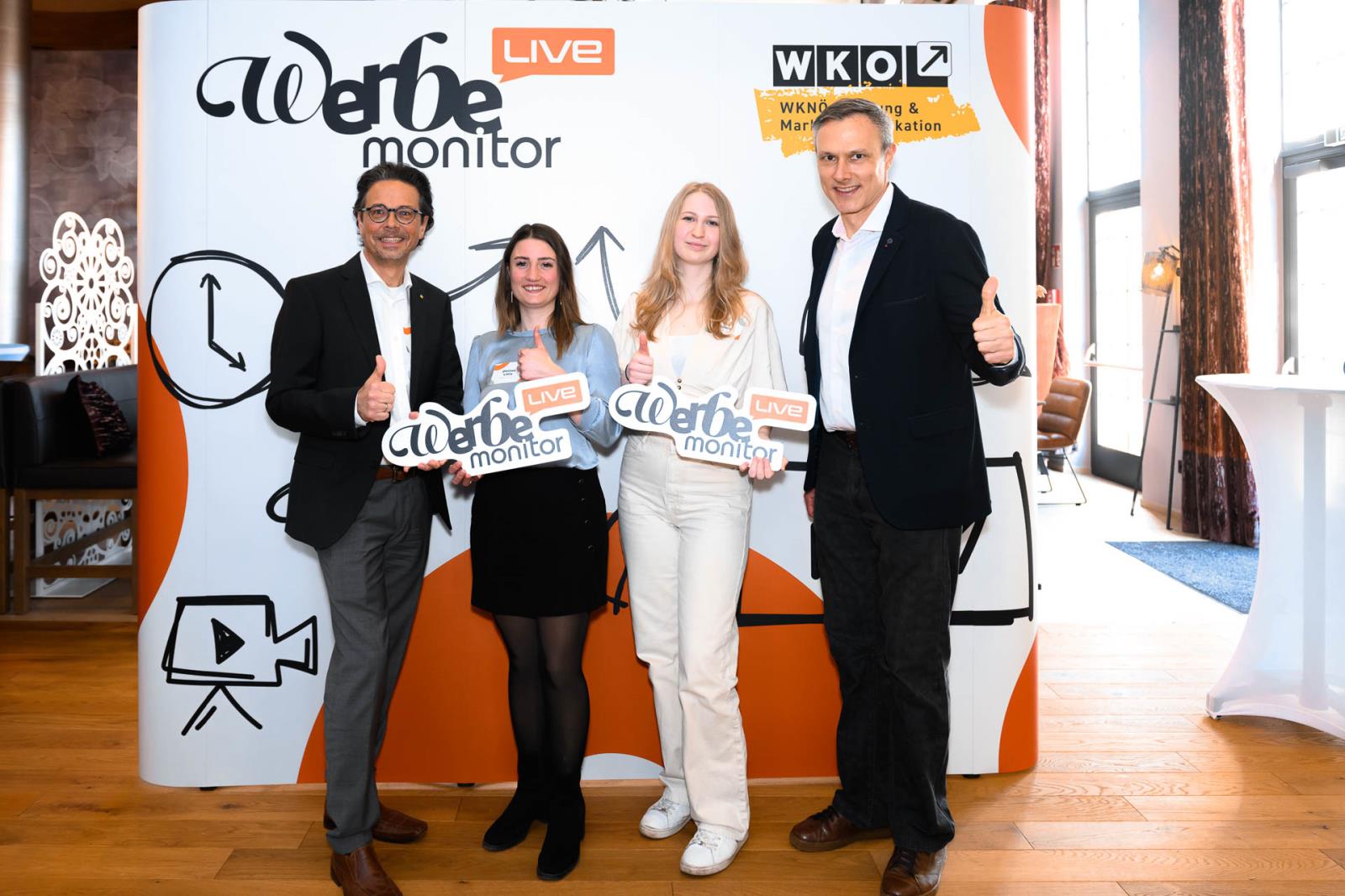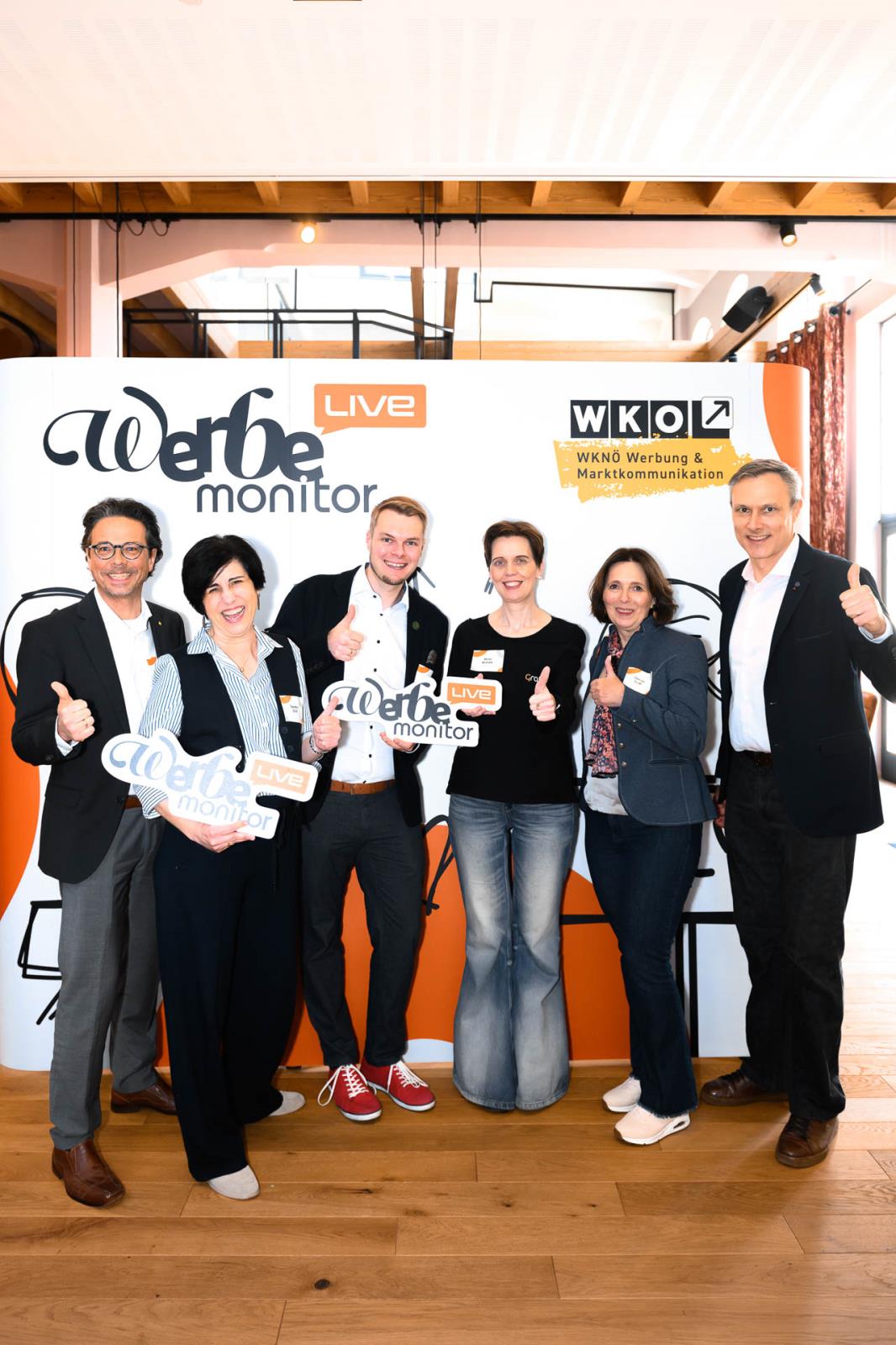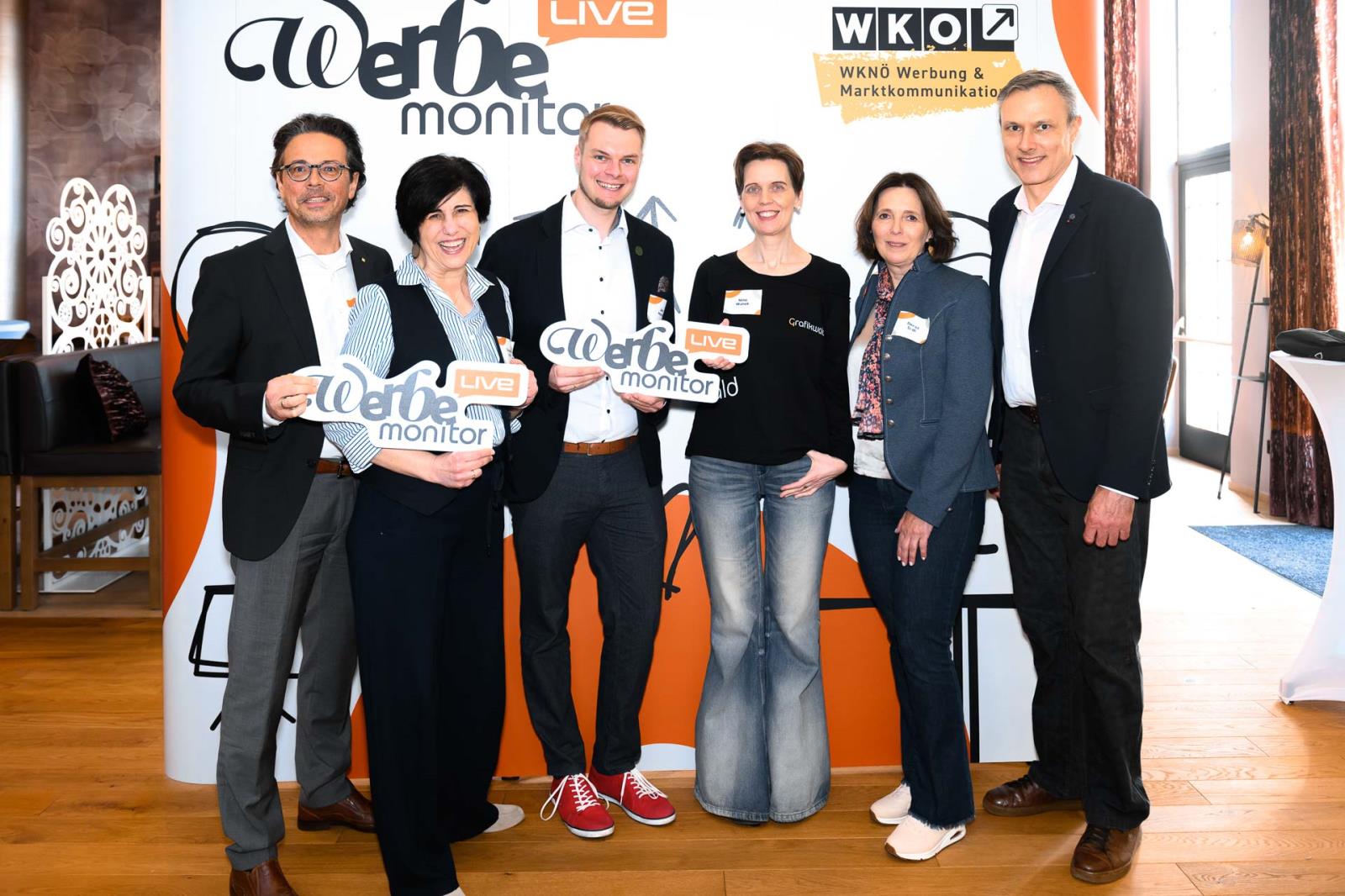 Werbemonitor LIVE, ein Format zugeschnitten auf die Werbe- und Kommunikationsbranche mit: Fachgruppenobmann Andreas Kirnberger, Fachgruppengeschäftsführer Clemens Grießenberger, Ausschuss-Mitglied Andreas Roffeis, Fachgruppenobmann-Stv. Timm Uthe, Julia Lipp, Ausschuss-Mitglied Herbert Sojak, Vanessa Wurster, Sebastian Podesser, Kerstin Oberzaucher, Ausschuss-Mitglied Bernhard Dockner, Marco Lumsden, Max Niederschick, Richard Weiretmayr, Werbemonitor-Chefredaktion Sabine Wolfram und Fachverbandsobmann Jürgen Bauer (v. l.)